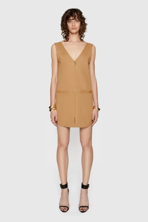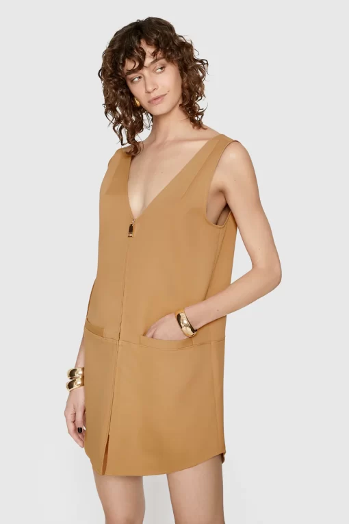 The Adrian Dress will have all eyes on you. This sleek design features a deep V-neckline that adds a touch of allure, along with front pockets and a bold zipper front.