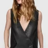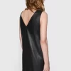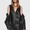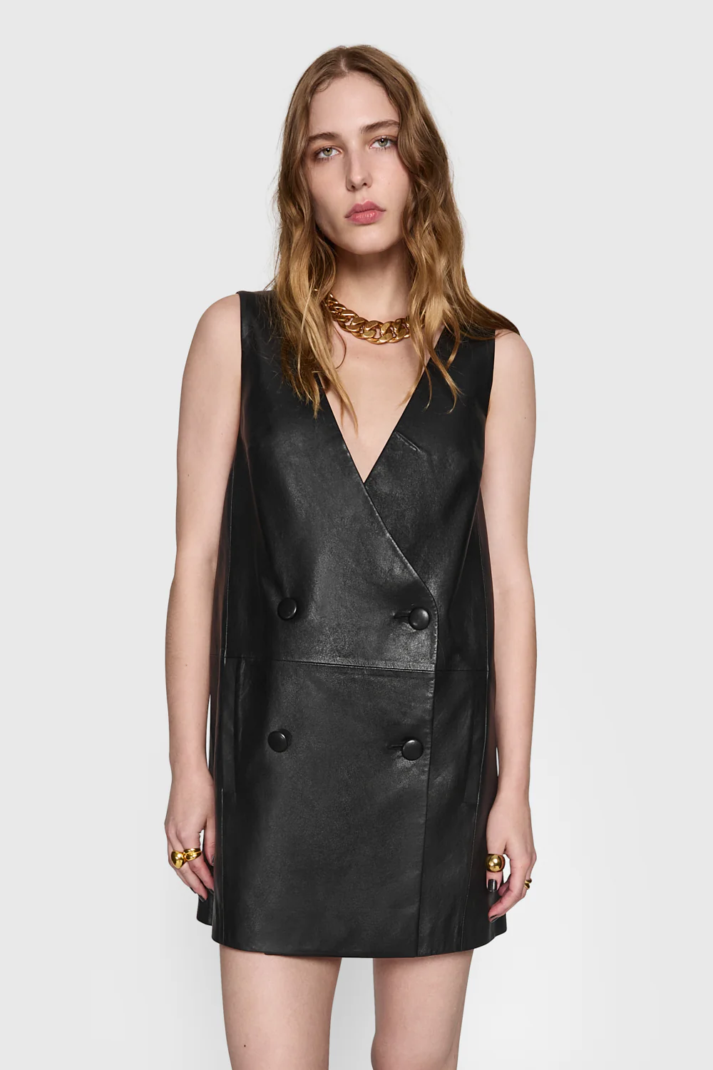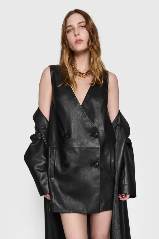 The Ari Blazer Dress exudes contemporary chic with a hint of sophistication. Crafted in sleek leather, this sleeveless mini dress features a collarless design and is adorned with four self-covered buttons at the front. Perfect for making a bold statement, it offers a modern twist on classic tailoring, ideal for both day and evening occasions.