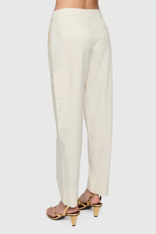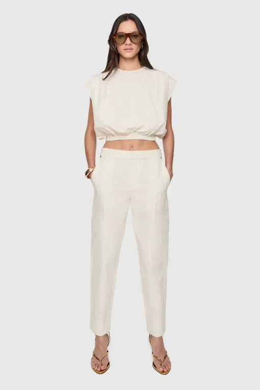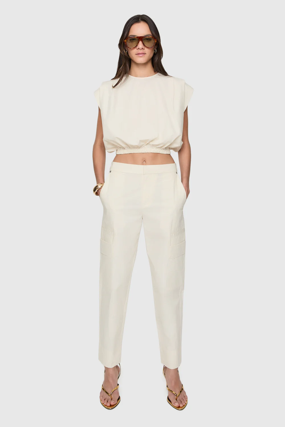 The Callie Crop Pant is a versatile cotton poplin design featuring front patch pockets and welt pockets at the back, with a J fly opening at the center front. The clean waistband and subtle metal rivets at the slash pockets offer a polished, modern look perfect for day-to-night styling.