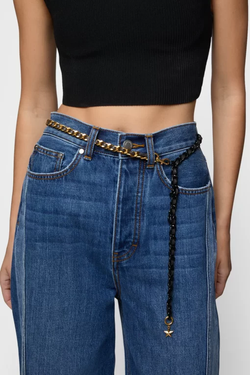 Elevate your outfit with this bold chain belt. Designed with an interwoven black leather and gold-tone chain, this versatile piece adds instant sophistication to your wardrobe. The belt is finished with a playful dangling star charm, creating a unique, eye-catching accent. Wear it over dresses, tunics, or blazers for an effortlessly chic look.