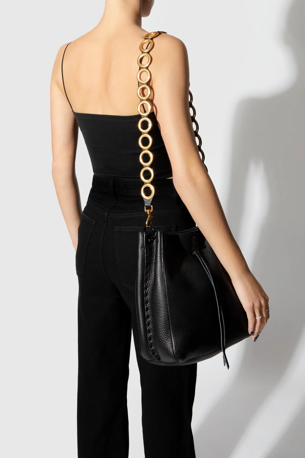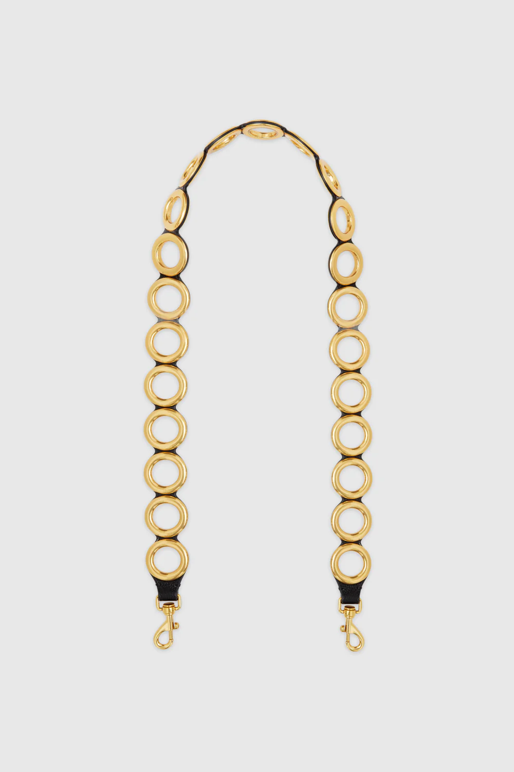 Give your handbag a fresh update with our new antique brass Guitar Strap crafted from premium leather and made bold with eyelet embellishment.