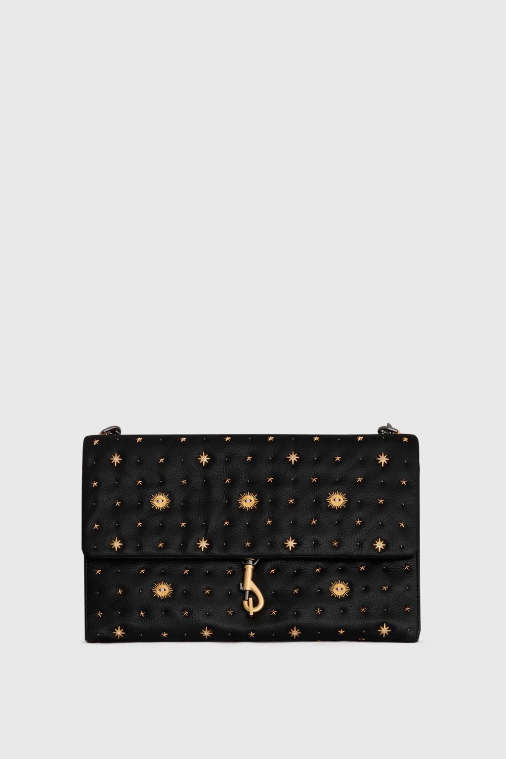 This large shoulder bag strikes the perfect balance between chic and effortless. With its beautiful evil eye studs, a chain link strap and dog clip, this will chic-ly keep your necessities organized. The fold-over flap keeps things simple, while the chain adds a little shine without being over the top. Whether you’re heading out for a night with friends or elevating your everyday, this bag has you covered with understated elegance.