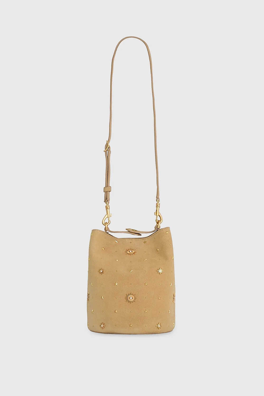 Bring playful edge to your everyday with the Evil Eye Studded Bucket. This standout style features an embossed evil eye motif, antique brass hardware, and a rounded bucket silhouette. Whether in rich Adriano Suede or embossed cow leather, it’s a conversation starter you can sling on with ease.