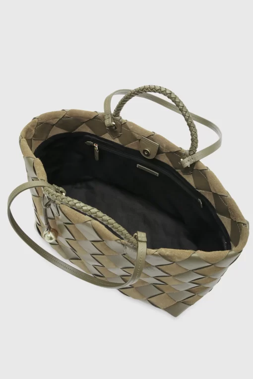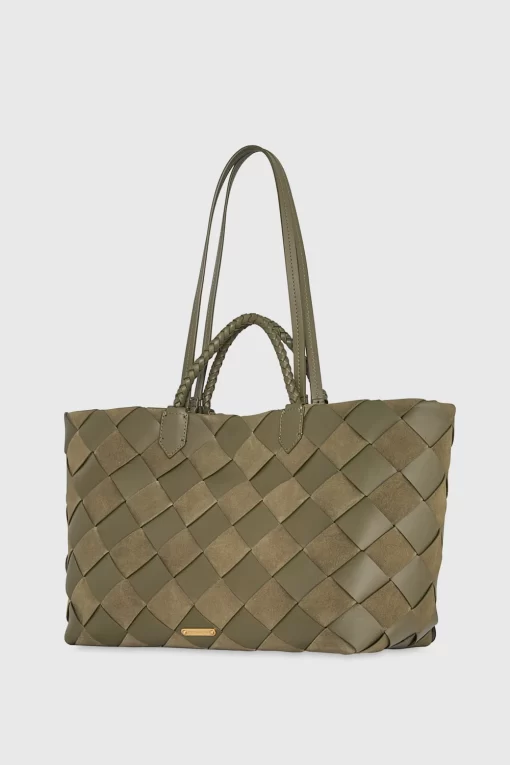 A relaxed silhouette meets rich texture in the Frankie Woven Tote. Designed with handwoven leather and soft knotted handles, this spacious carryall delivers easygoing elegance from weekday errands to weekend escapes. The signature gold D-ring charm adds a bold finish, while the unlined interior keeps things effortlessly light.