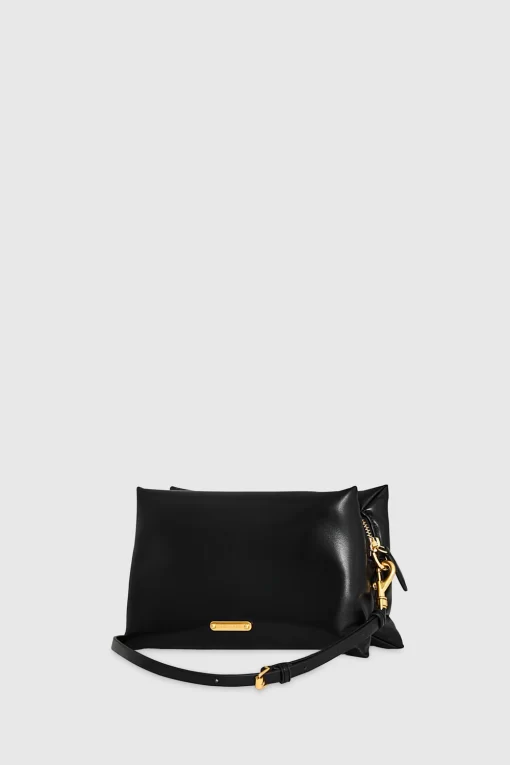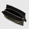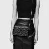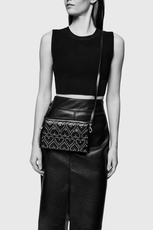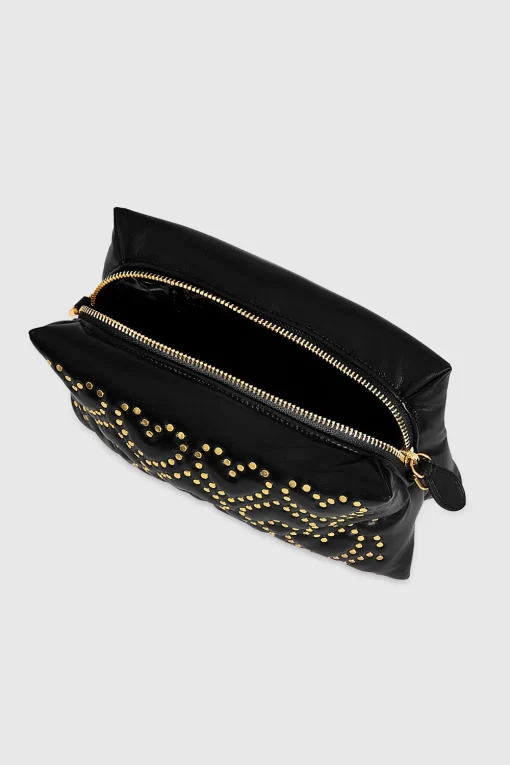 This crossbody bag combines a sleek black silhouette with playful heart-shaped stud patterns in gold-tone detailing. Compact yet roomy enough for your essentials, it features an adjustable strap for versatility and a zipper closure to keep everything secure. It’s the perfect accessory to add a touch of charm with a little edge.