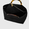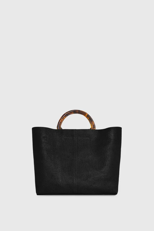 Refined structure meets modern flair. The Square Tote With Resin Handle is a sophisticated statement piece, designed in soft black leather and accented with smooth, tortoise-inspired resin handles. Its clean lines and spacious interior make it the perfect companion for everyday carry—elevated enough for the office, yet bold enough for weekend style.
