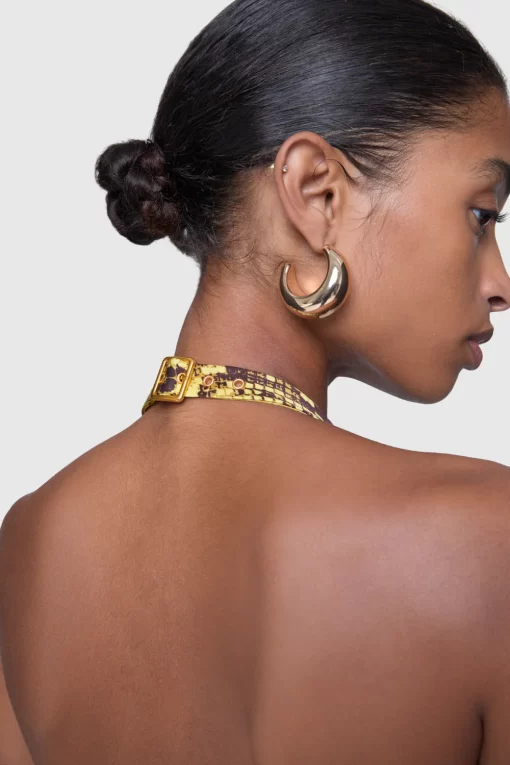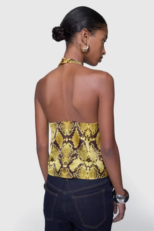 The Isadora Halter top exudes elegance with its fierce snake print. Featuring a sleek halter neckline and a metal buckle at the back of the neck, this piece is perfect for turning heads wherever you go.