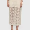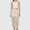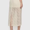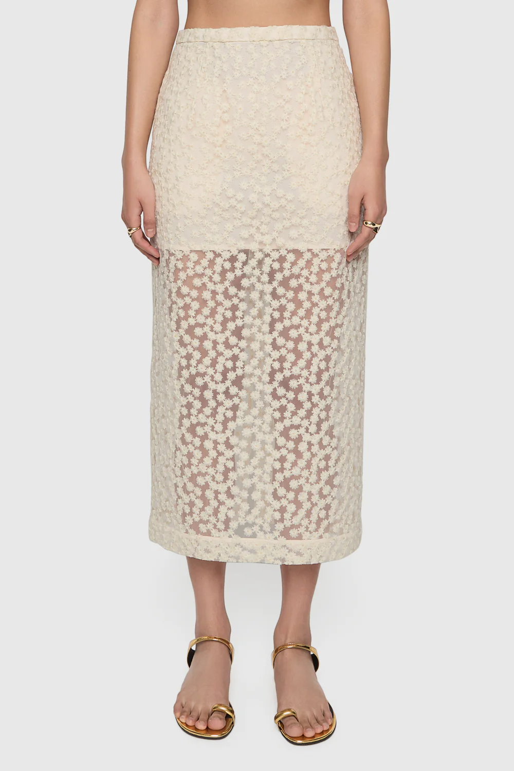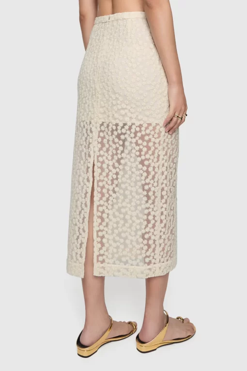 The Jaci Midi Lace Skirt features intricate floral lace with a half-lined design, creating a sheer finish at the bottom for an ethereal touch. A subtle slit at the center back ensures ease of movement, making this skirt both elegant and practical.