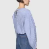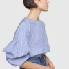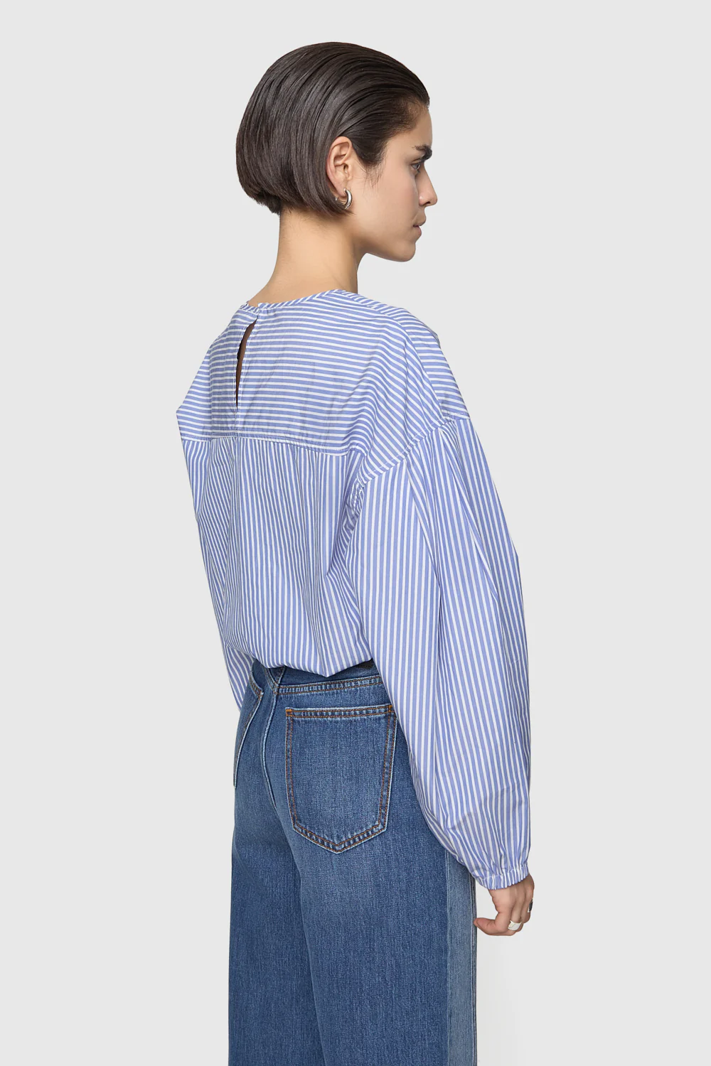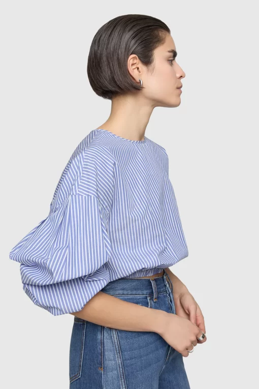 The Julia Stripe Long Sleeve Top is a breezy cotton poplin piece featuring a playful striped pattern and tunneled elasticated bottom openings. Dropped armholes, pleated sleeves, and a keyhole back neck detail add unique touches to its relaxed, elevated style.
