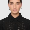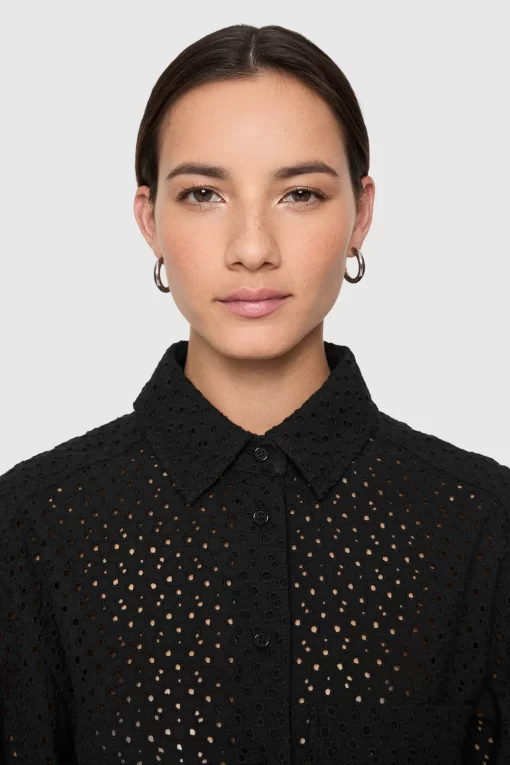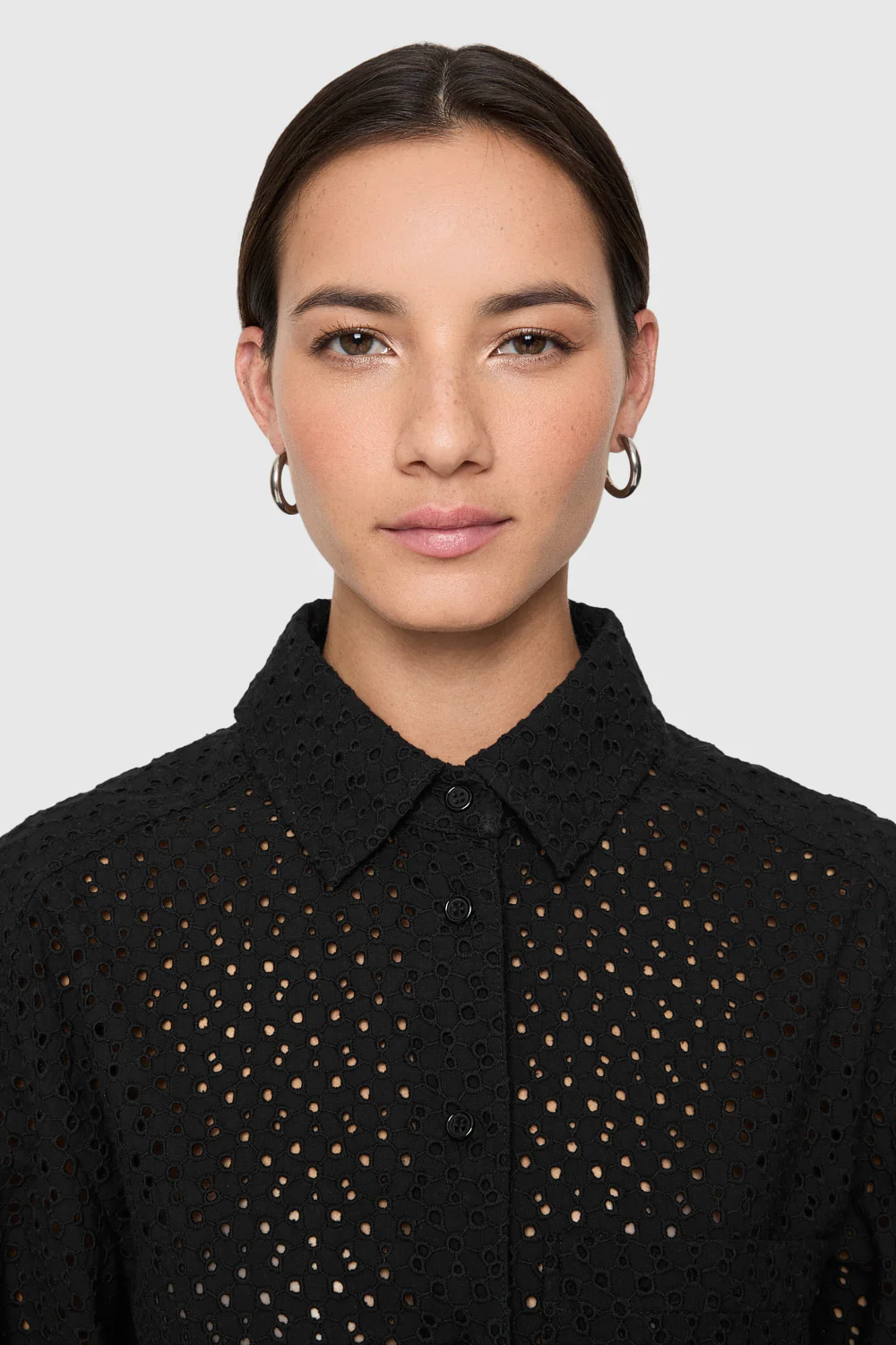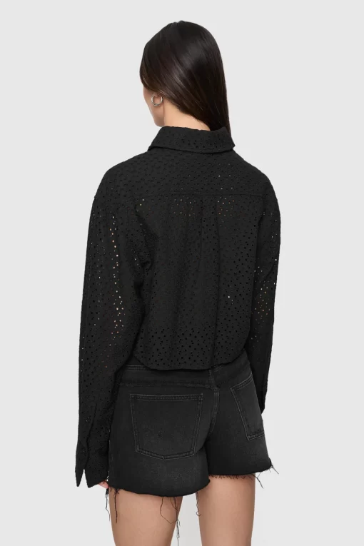 The Juna Crop Eyelet Blouse is a long-sleeve, button-down design featuring a patch pocket on the left chest, perfect for those cooler summer nights. Its airy eyelet fabric brings a touch of femininity to an effortlessly relaxed look.