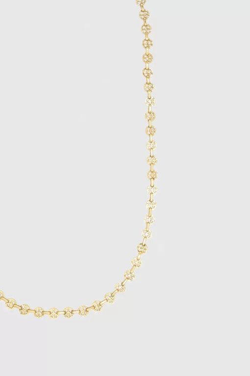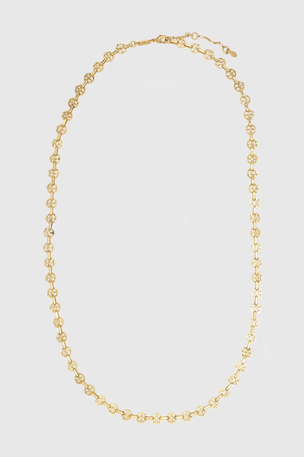Molded with peace signs, this hammered gold necklace looks just as good solo as it does layered with other styles.