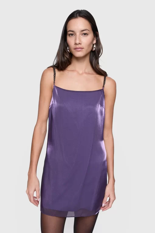 The Rowan Organza Dress captures the essence of ’90s nostalgia with its chain straps and sleek organza fabric. Featuring a straight neckline, this mini dress combines retro inspiration with classic style.
