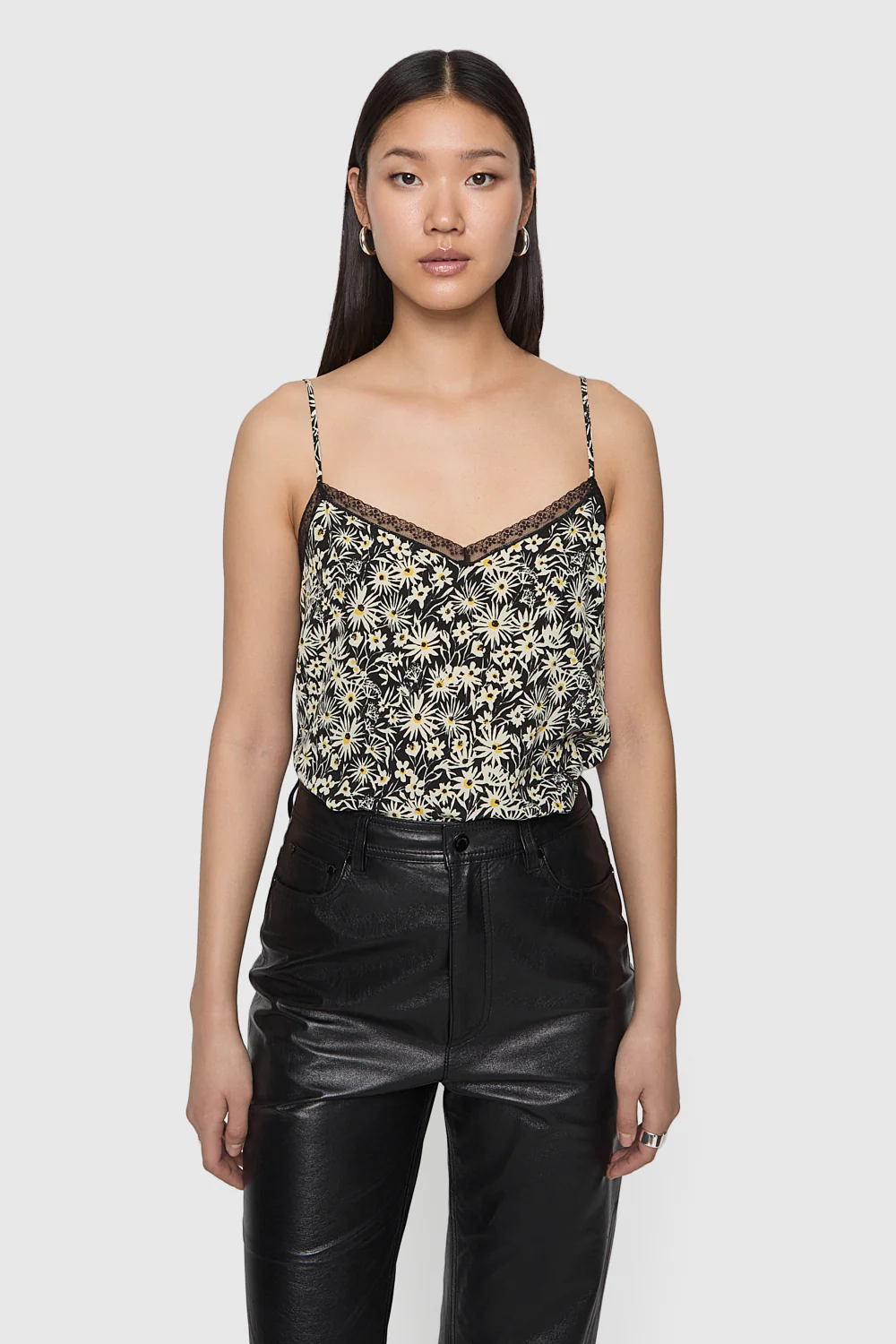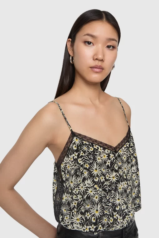 The Sara Lace Cami Top combines a bold graphic daisy print with delicate lace trim at the neckline and hem, offering a perfect mix of effortless femininity and edgy detail for any occasion.
