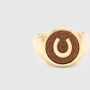 Consider this your new good luck charm. This signet style ring is crafted from polished, shiny gold and features a horse shoe in its center.