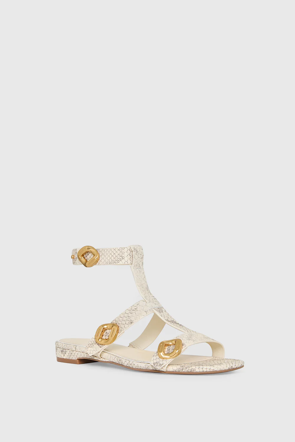 The G Gladiator Sandal features a minimalist flat design with bold curb link buckles for a modern touch. A padded insole and mini wedge heel ensure comfort for every step.