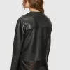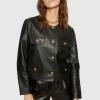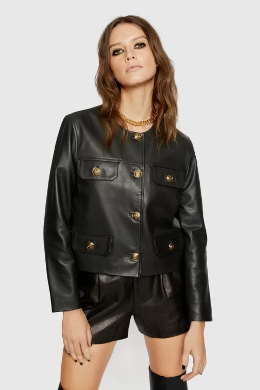 Made of soft, premium leather, our fave top layer for spring is both feminine and edgy with multiple exterior pockets and oversized buttons.